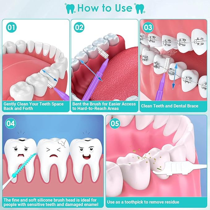- ESSENTIAL DENTAL CARE TOOLS FOR BRACES: These interdental brushes are essential tooth cleaner tools for families. The 360° bendable brush head can easily clean blind spots of braces, crowns, bridges, implants, and teeth. You can easily clean braces at home, saving time and money from multiple trips to the dentist