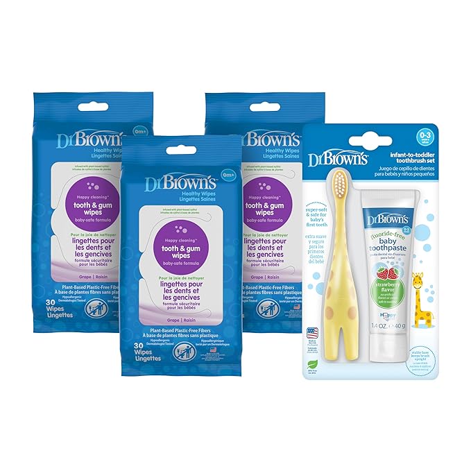 Dr. Brown's Tooth and Gum Wipes 30 Count 3-Pack, Infant-Toddler Toothbrush and Toothpaste Set with Strawberry Toothpaste - Giraffe - 1.4oz - 0-3 years