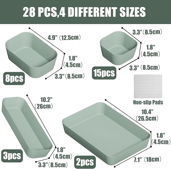 - 【Multiple Sizes】 28pcs customizable drawer bins includes 4 sizes: 3.3" x 3.3" x 1.8" (15 pcs), 4.9" x 3.3" x 1.8" (8 pcs), 10.2" x 3.3" x 1.8" (3 pcs), 10.4" x 7.1" x 1.8" (2 pcs), you can customize the combinations, It’s easy to find a configuration that works for your drawers or desktop.