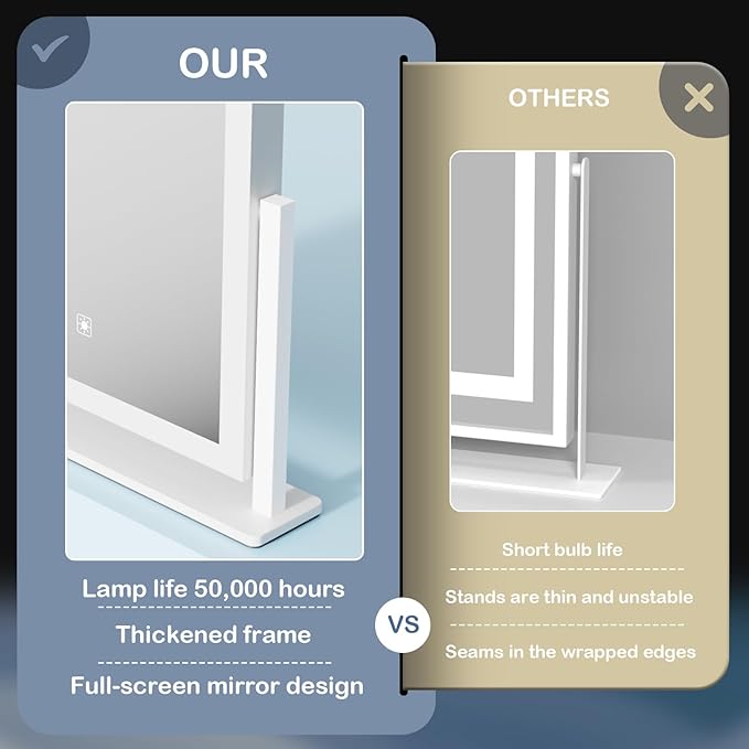 - 👍【Upgrade brightness】Most of the makeup mirrors with light bars on the market only have 80 light beads, which makes consumers feel that the lighting is not enough. We have improved on this! We have a full 120 light beads light bar per meter,which greatly improving the brightness of the makeup mirror.