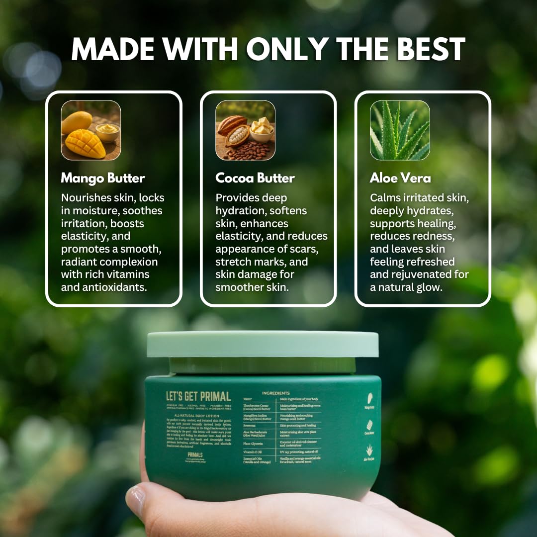 - DEEP MOISTURIZATION: Made with cocoa butter, mango butter, aloe & more - your skin will thank you for the hydrating and nourishing ingredients in our PRIMALS body lotion. Say goodbye to dry, ashy skin!