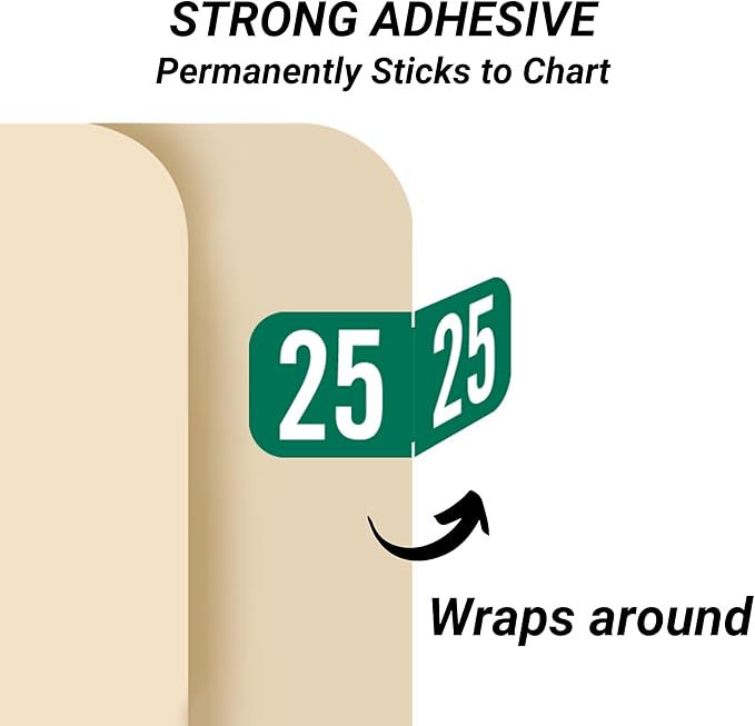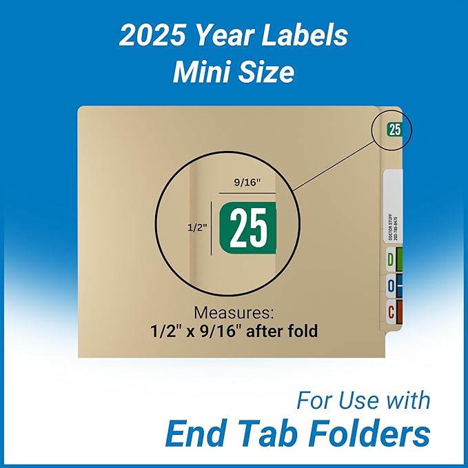 - BUILT TO LAST: Made specifically for file folders and filing systems, our green colored 2025 year labels have a heavy duty adhesive so they don't fall off patient charts. They're compatible with Tab Products 1287 series.