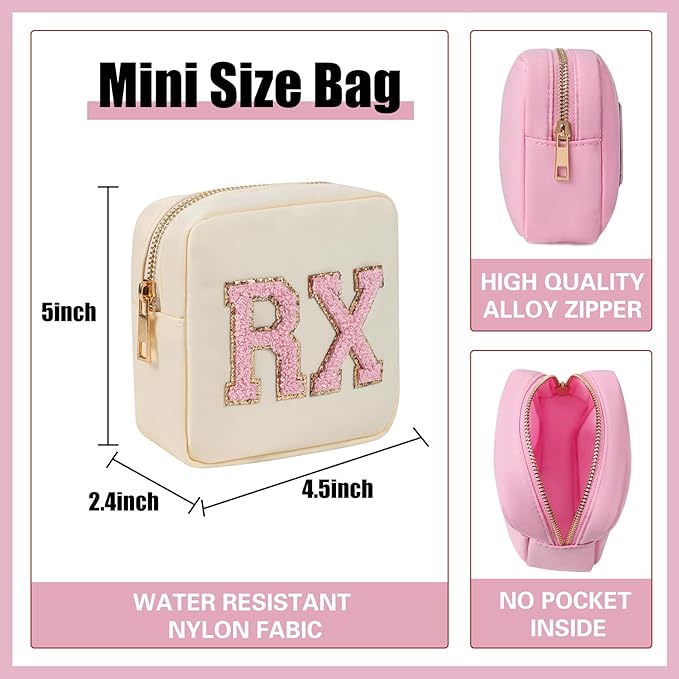2pcs Personalized Chenille Letter Patch MEDS and RX Bags Set,Cute Nylon Drug Medicine Travel Makeup Bag with Zipper, Preppy Vitamin Organizer Bag for Women and Girls (RX+MEDS Beige)