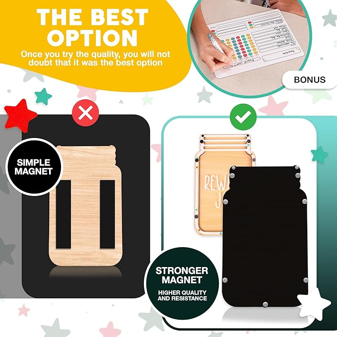 - ⭐ MOTIVATION AND POSITIVE DISCIPLINE - Tired of struggling to get your kids to do their homework? Our magnetic star jar reward system is the answer! Turn chores into a fun game and watch your child's motivation soar. It's the perfect way to make learning exciting and boost their confidence.