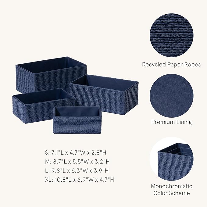 LA JOLIE MUSE Storage Baskets for Organizing - Set of 4 Sturdy Woven Paper Rope Decorative, Stackable Wicker Baskets for Makeup Closet, Bathroom, Bedroom (Navy Blue)