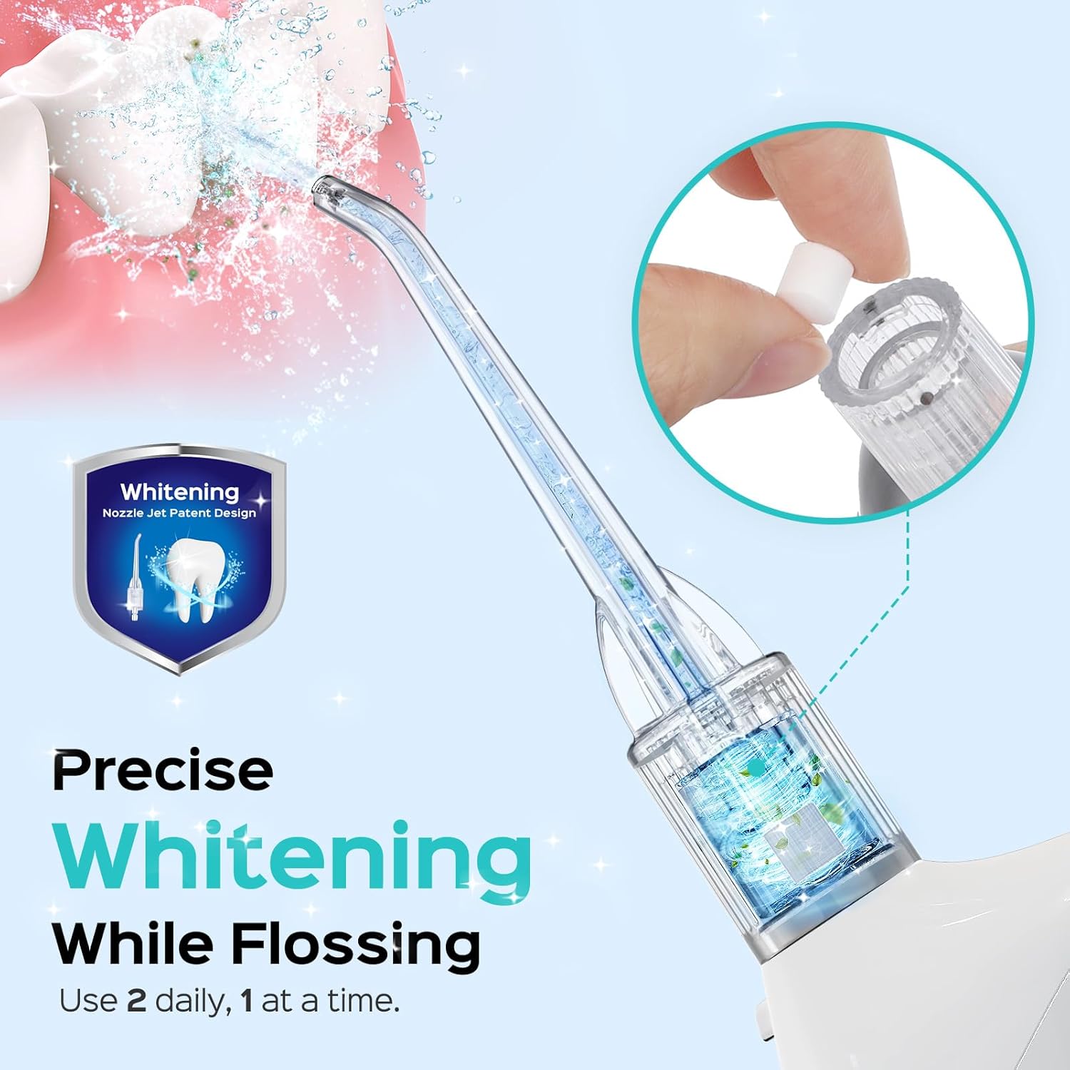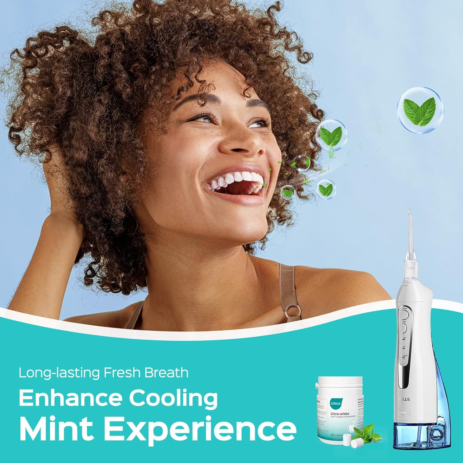 - Ultra-Value 2-in-1 Deep Clean & Whitening Oral Care Kit: 14-day color improvement and interdental brightening. Compared with using water flosser alone, COSLUS water flosser pick with whitening mint refills offers 3X more effective cleaning for coffee stain, braces gaps and enamel stains, providing a refreshing minty experience. 3 multi-functional nozzles meets the oral care needs of braces orthodontic care and sensitive gums. Bringing you a brighter smile and more confident social life