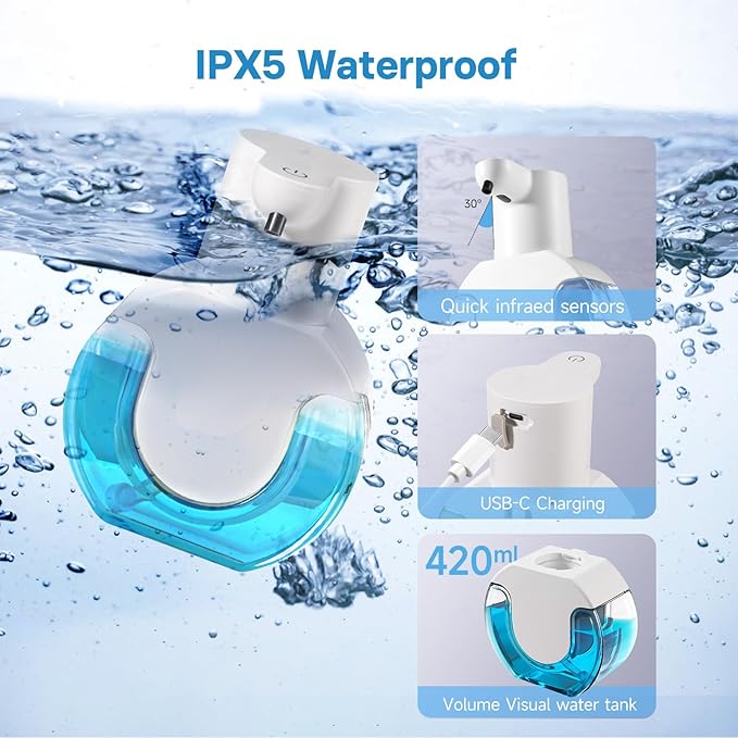 - High Quality and Durable:The foaming soap dispenser has IPX5 waterproof function,so you can use it in wet environments,as long as you ensure that the sensor and charging port are dry! USB is rechargeable and can be used continuously for up to 60 days on a full charge.(Misunderstanding due to differences in usage frequency)