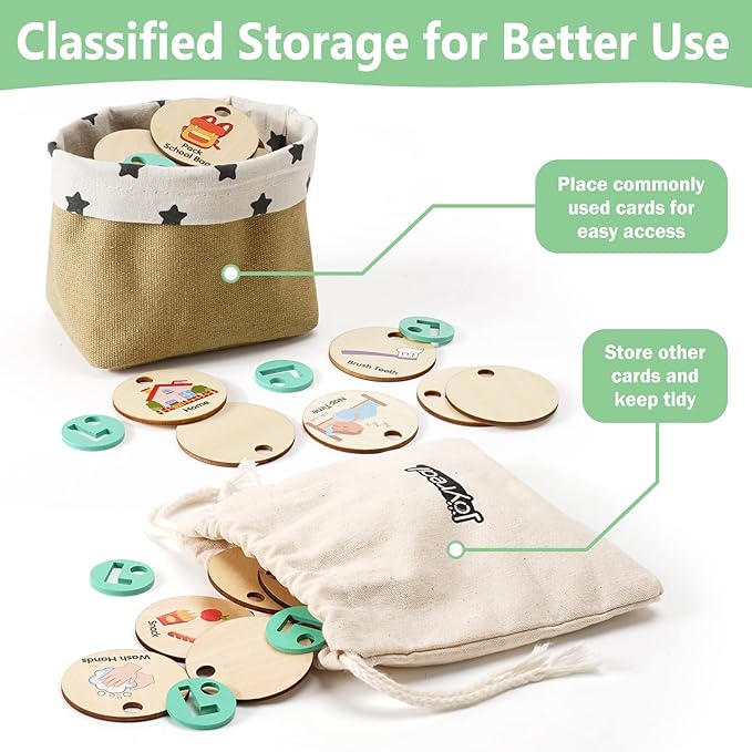 - Thoughtful Design and Quality: Our schedule is made of premium wood with smooth, burr-free edges and measures 13.2 x 12.85 inches for toddlers and preschoolers. The categorized design of the storage bag and basket makes everyday use a breeze! You can keep frequently used cards in the basket for easy access, and put the rest in the storage bag to keep them tidy. Tips: When placing cards on the board please make sure the hanging board is vertical to prevent the cards from falling.