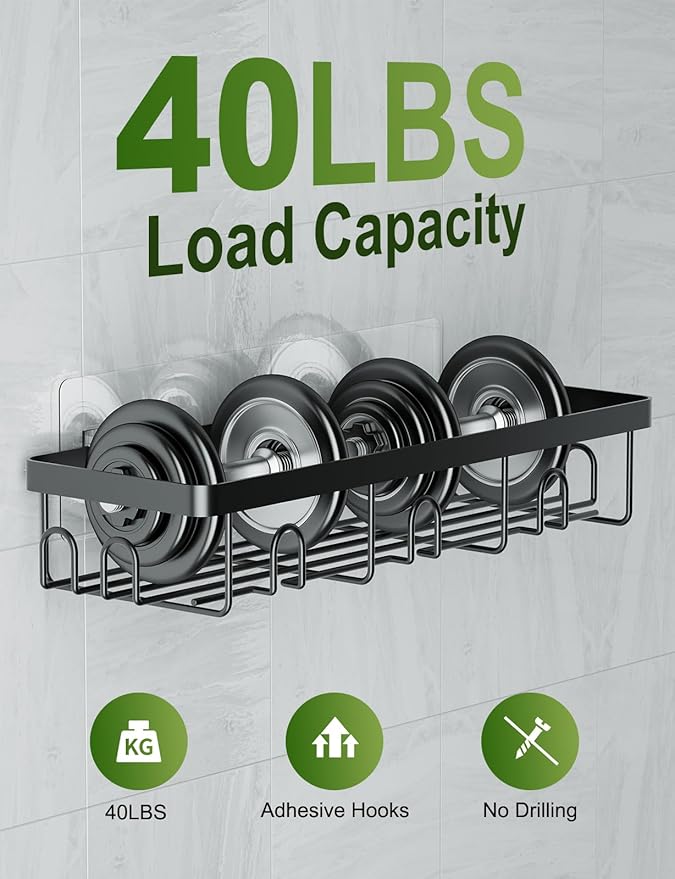 - Enhanced Load Capacity of 40 LBS: Our upgraded transparent adhesive hooks significantly improve the stability of the rack, allowing for an impressive load capacity of up to 40 lbs. These hooks maintain aesthetics and functionality while ensuring a secure hold. The bathroom storage shelves are equipped with rounded corners to prevent scratches and protect your skin during use. Rest assured, our stable wall-mounted shower organizer is designed for safe and reliable use.