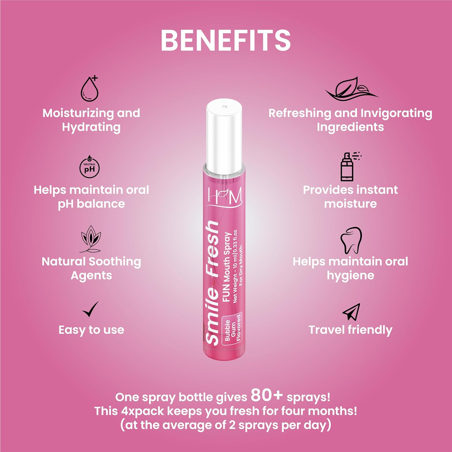 - VARIETY OF REFRESHING FLAVORS: The HM Dry Mouth Fun Flavored Spray comes in a pack of 4, featuring unique and delightful flavors – Buble Gum, Cotton Candy, Peach, and Apple. This variety allows users to enjoy a different taste experience each time they use the spray.