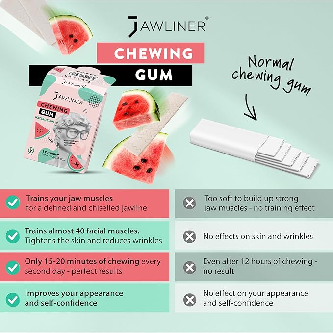 Jawliner® Hard Jwaline Chewing Gum - Sugar Free Watermelon Tough Jaw Gum - Jaw Exerciser Strong Mewing Jawline Mistic Gum - 2x Harder than Regular Chewing Gum 130 Grams (48 Strips)