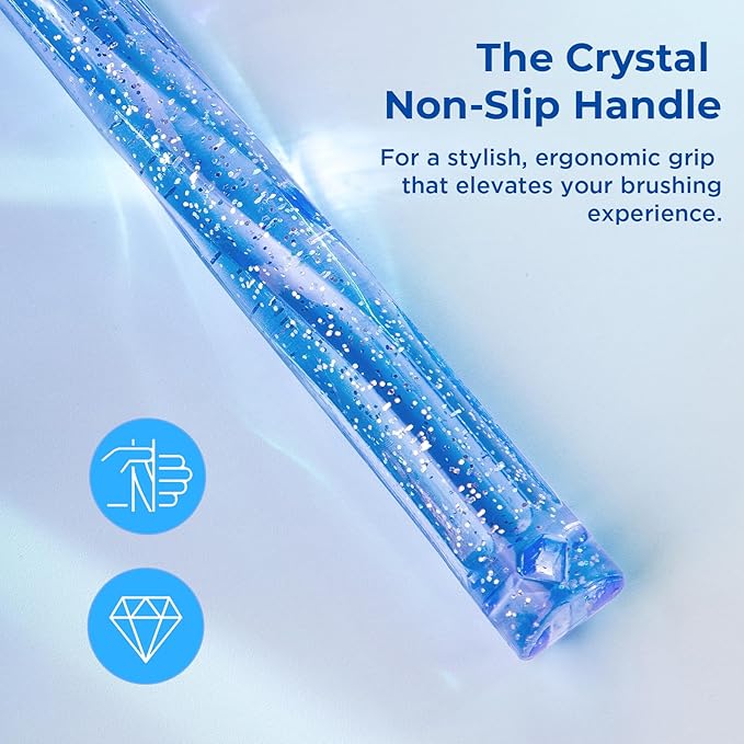 - Starry Crystal Handle: Designed with an ergonomic grip in mind, our very soft toothbrush's handle features spiraled wave patterns that fit snugly in your hand, it provides a secure and comfortable grip. The starry crystal design sparkles under the light, turning each brushing session into a dazzling affair
