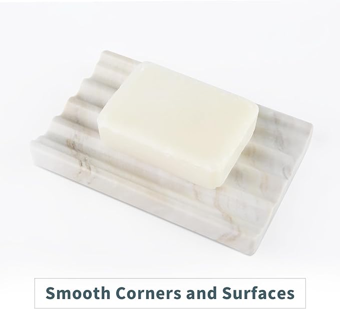 - EXCELLENT DESIGN: Square bar soap dish for holding soap, designed in a wave shape with raised edges. This soap dish drains the soap effectively, preventing it from slipping out and keeps soap clean and dry. The heavy marble soap holder comes with 4 non-slip pads, the pads are under the box for better water leakage.