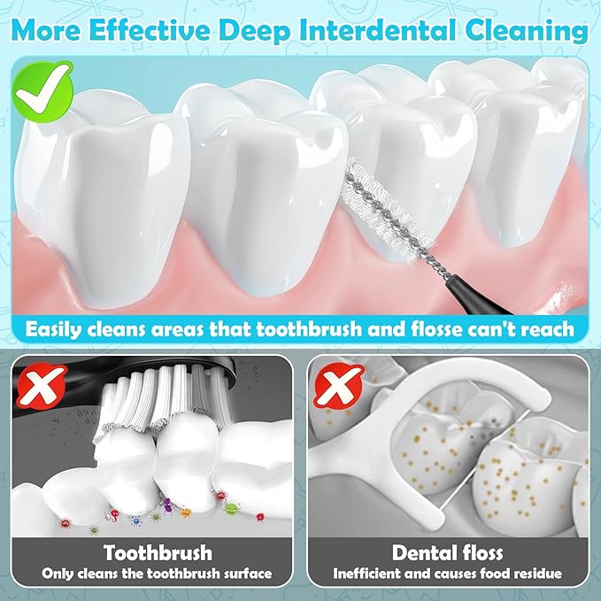 - 【Efficient Oral Cleaning】 The toothpick with bristles can be inserted directly between teeth, easily cleaning food residue and plaque that toothbrushes cannot reach. Greatly improve the efficiency of oral cleaning, helping teeth stay healthy and white. Using our interdental brushes before brushing can effectively prevent various oral problems, keeping you away from bad breath, dental plaque, tartar, yellow teeth, toothache, and cavities.