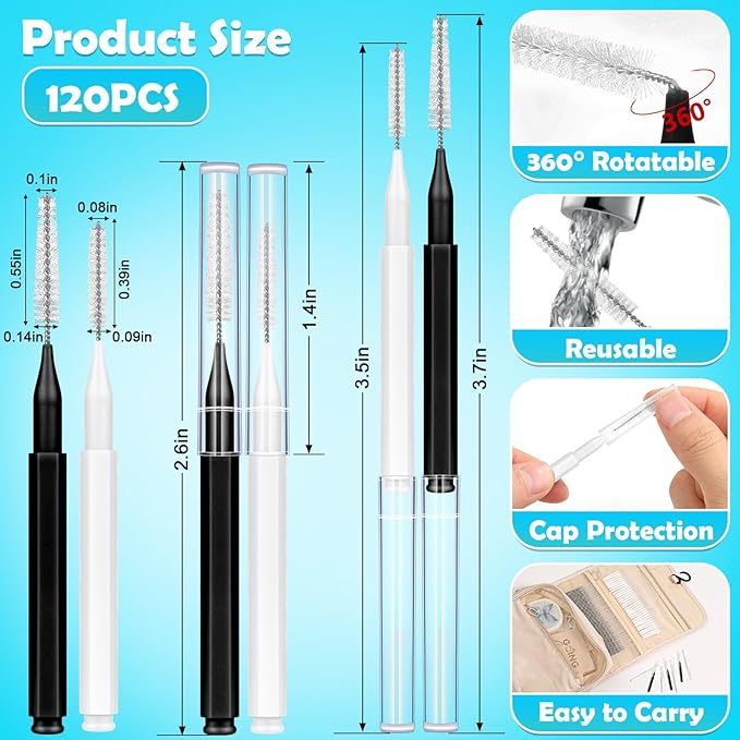 - Large Quantity & Lightweight Convenience】 You will receive 120 black and white interdental brushes and a storage box, with plenty of brushes to meet your long-term daily use needs. The brush heads are protected by transparent covers to keep them clean and hygienic. Suitable for various occasions such as at home, travel, outings, work, and school. Provides you with a simple and effective way to clean your teeth, and also makes a great gift for family and friends.