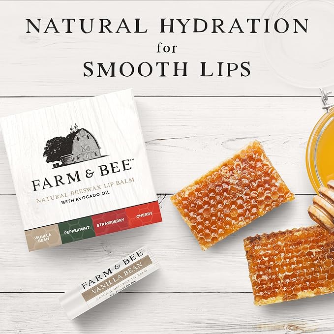 Natural Lip Balm – Variety Pack - Organic & Natural Ingredients - Beeswax Based Lip Care Chapstick - Great Gift - Farm & Bee - 0.15oz (Pack of 4 - Vanilla Bean/Peppermint/Strawberry/Cherry)