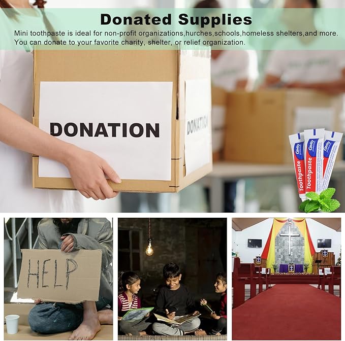 - Donated Supplies:Travel toothpaste bulk is ideal for non-profit organizations, churches, schools, homeless shelters, and more. You can donate to your favorite charity, shelter, or relief organization