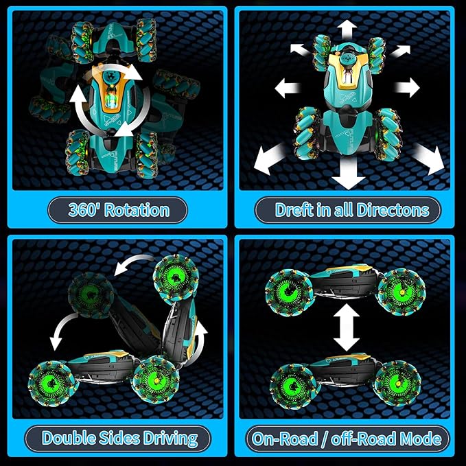 - Dual Controls: It's an exciting and interactive way to play with the car toys,Awesome Boys Toys 4-6-12,child the power to control the action with just a wave of their hand;The innovative 2.4 G gesture-sensing technology and Multi-function remote control handle allows them to master the stunt car’s impressive moves,engaging play experience,Great remote control car for boys 4-7-12