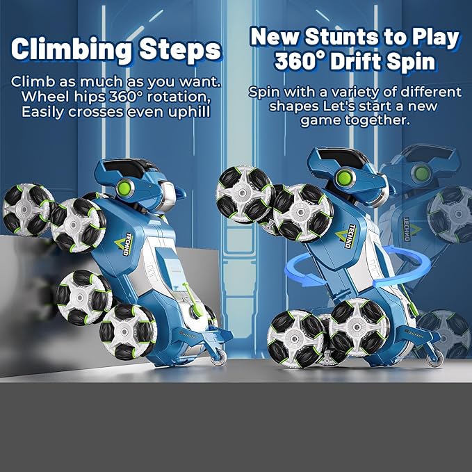 - 360-Multiple Stunts:awesome stunts such as Drifting all direction, moving sideways, and revolving 360 degrees…Forward/backward,turn right/left, right/left drift, extreme 360 rolling, Climbing the ladder,8WD driving, transform mode,Whether playing indoors or outdoors, It’s a thrilling way for kids to explore physics and mechanics,will keep them captivated for hours,Very cool kids toys boys 6-8-13