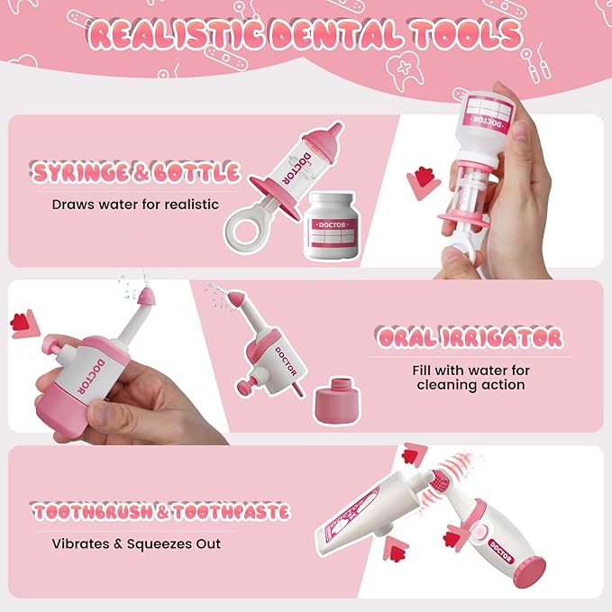 - Engage in Doctor Role Play! Wear a stethoscope to simulate heartbeat checks, use a lighted dental mirror for oral exams, operate a dental drill to treat cavities, and brush with an electric toothbrush. Hands-on pretend play fosters an understanding of dental health and deepens kid's knowledge of a dentist's role.