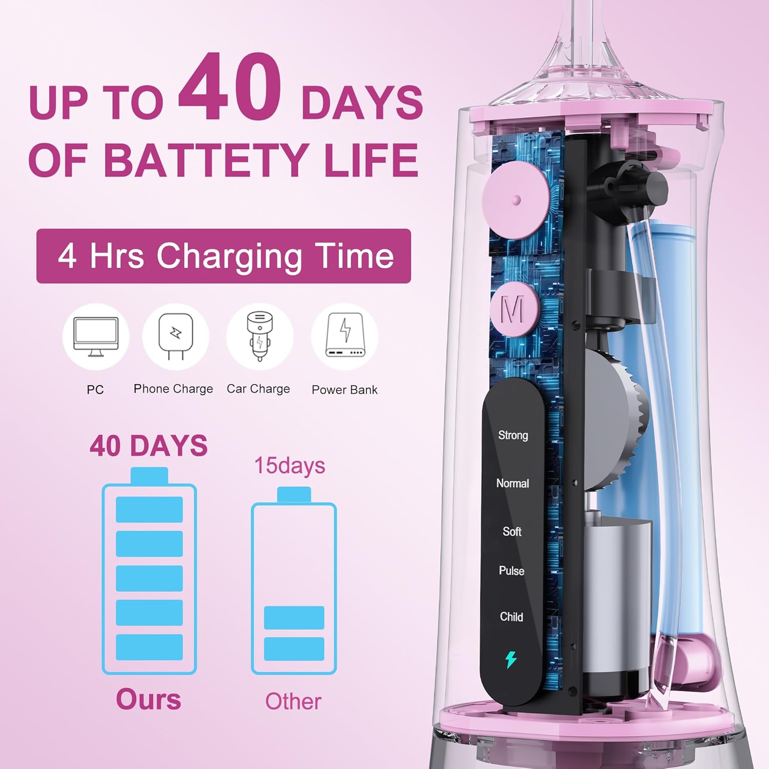 - 【40 Days Long Usage&Powerful Battery Life】MOCEL Cordless water dentel flosser is powerful and the Powerful battery takes 4 hours to fully charge and lasts 40 days of continuous use. The cordless design makes it easy to use at home and on the go, Note: The charging adapter is not included, But the dental floss equipped with USB C cable is ideal for home, travel, office or business trips