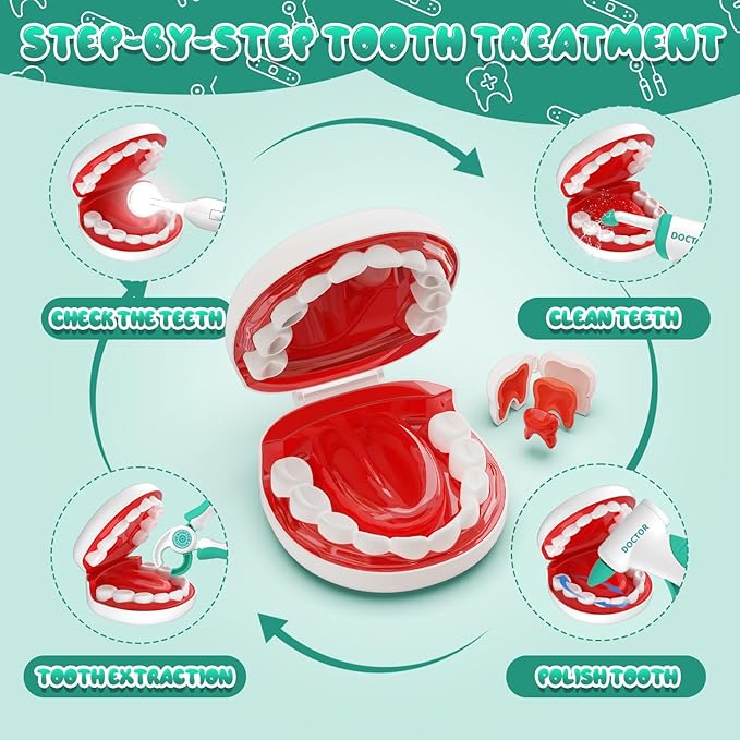 - Kids Doctor Tool Playset: With over 20 realistic dental and medical tools, including a stethoscope, syringe, dental mirror, pliers, drill, toothbrush, teeth models, a patient doll, and various other accessories. Children can perform 'check-ups' and 'teeth cleanings,' enabling them to simulate medical procedures and helping them overcome any fears of dental visits.