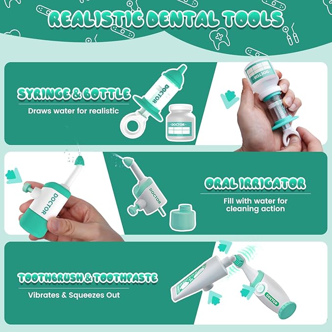 - Engage in Doctor Role Play! Wear a stethoscope to simulate heartbeat checks, use a lighted dental mirror for oral exams, operate a dental drill to treat cavities, and brush with an electric toothbrush. Hands-on pretend play fosters an understanding of dental health and deepens kid's knowledge of a dentist's role.
