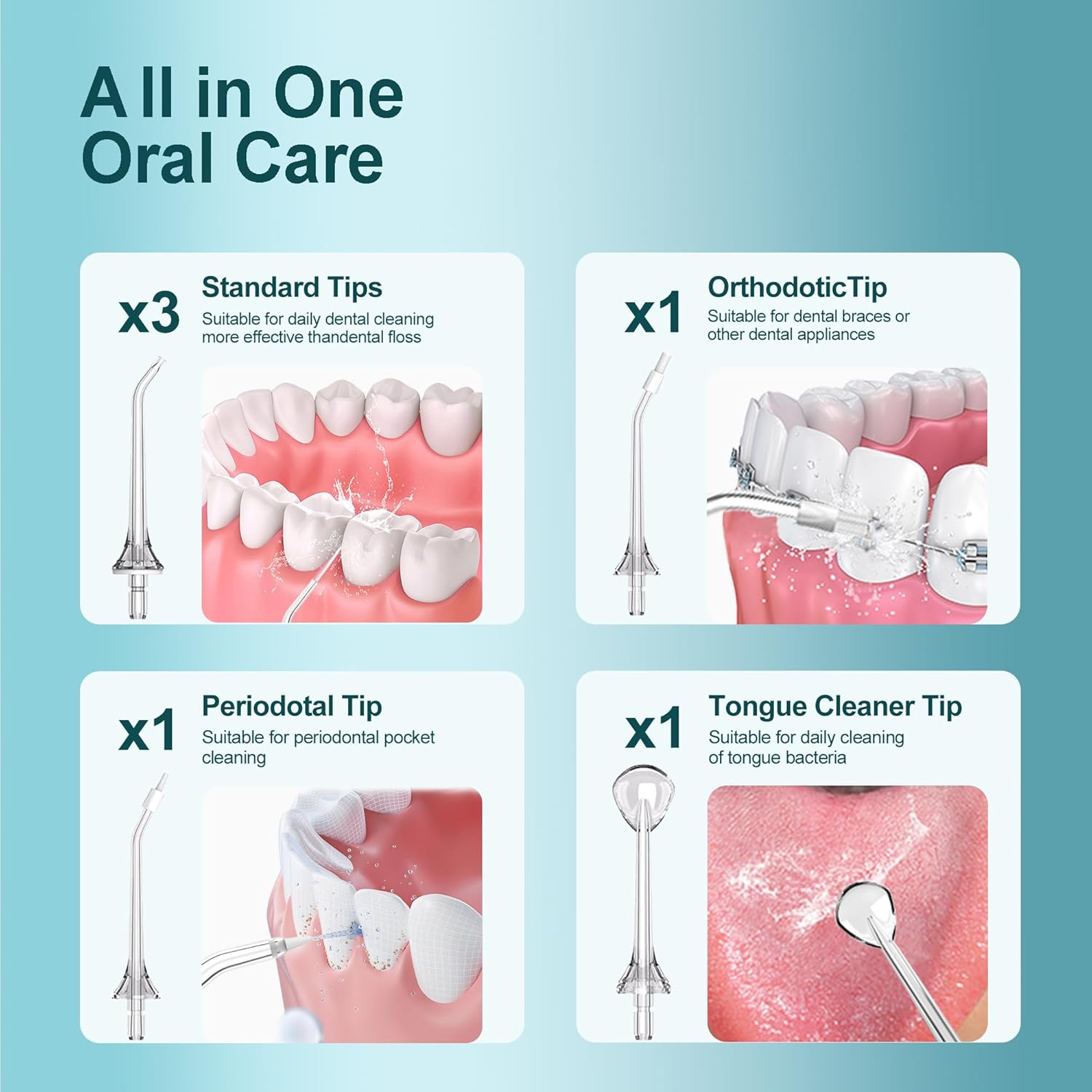 - 【Powerful Water Teeth clean&Improving your gums】Equipped with a strong pump the water dentel flosser tooth cleaner has a strong water pressure pulses frequency of 2200-3000 times per minute, 50-150PSI brings powerful water flossing, protects the gums in the environment to achieve deep cleaning of teeth, effectively removes 99.9% of dental buildup, effectively massages the gums, helps with bleeding gums, bad breath, and beneficial for orthodontic bracket and bridge care.