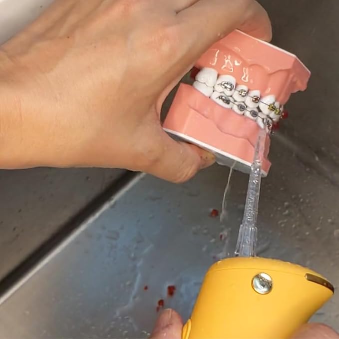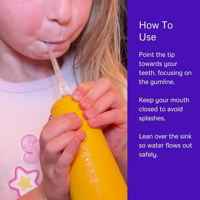 - [Portable] Cordless and lightweight, our oral irrigator is ideal for kids, and can easily go in the tub, shower, and travel with your family. 2 interchangeable jet tips are included, which cover the use for a single person for a whole year. The 360°rotatable nozzle allows to easily clean areas that are difficult to reach and prevents tooth decay, dental plaque, gingival bleeding, and help kids learn great dental care routines.