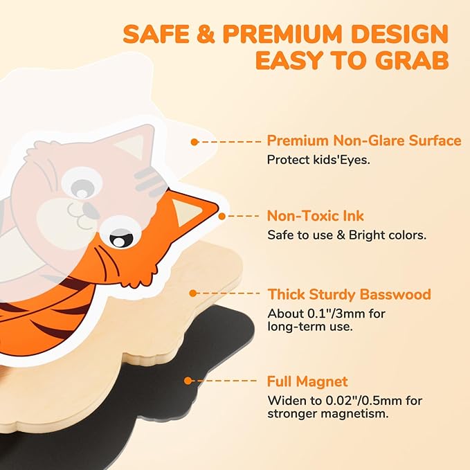 - Design for Kids: To provide kids with a better play experience, each animal magnet measures 2.8" x 2.4" x 0.14", offering a larger size and suitable thickness. The fridge magnets for toddlers feature a basswood interlayer, making them easier for little hands to grip. The full magnet backing ensures they won’t easily fall off