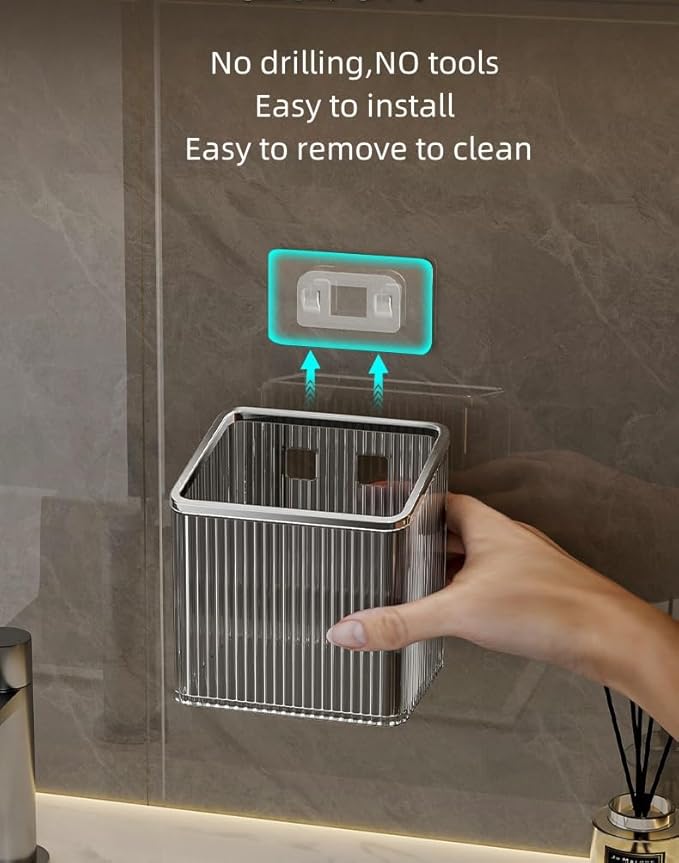- 4.Adhesive wall mounted toothbrush holder for bathroom, powerful and easy to install.Dimension:4.4" Lx 3.7" Wx 4.6" H, Help save space on counter, You can not only use this toothbrush holder for bathroom used as electric toothbrush, toothpaste, toothbrush,shaving foam, facial cleaner, mouthwash,electric shaver,razor holder,but also storage small items,such as makeup brush,comb, eyebrow trimmer, lipsticks, remote, cookware,silverware and cutlery,pen,Stationery.