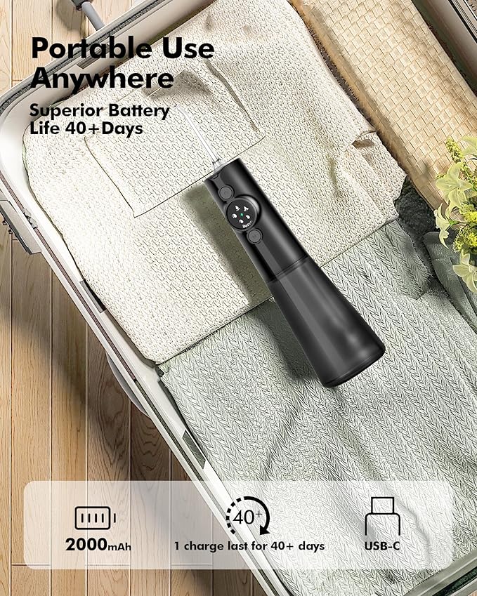 - 40-Day Long Battery Life: Bezvoi cordless water flosser is equipped with a 2000mAh battery that lasts up to 40 days. It includes a USB-C charging cable (without a 5V 1A adapter) and requires no dedicated charger, enhancing charging convenience. The lightweight and portable design makes it easy to store in luggage or backpacks, making it an ideal oral care companion for travelers, business travelers, vacationers, or frequent commuters