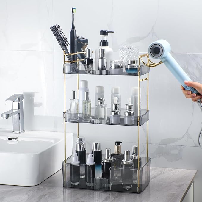 3 Tier Bathroom Organizer Countertop Makeup Perfume Tray Skincare Organizer Comes with Hair Dryer Rack and Toothbrush Holder for Bathroom Dresser Vanity (Grey)