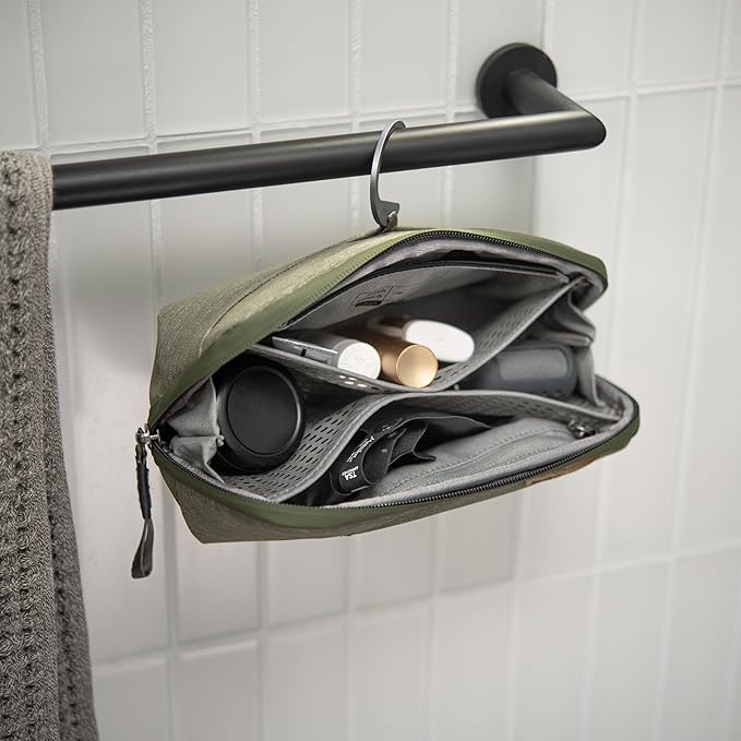 - THE ULTIMATE TRAVEL COMPANION: This standing toiletry bag sits upright on the counter or hangs neatly with a stowable aluminum hook. A burly #8 UltraZip opens wide for full access and resists abrasion for decades of reliable use.