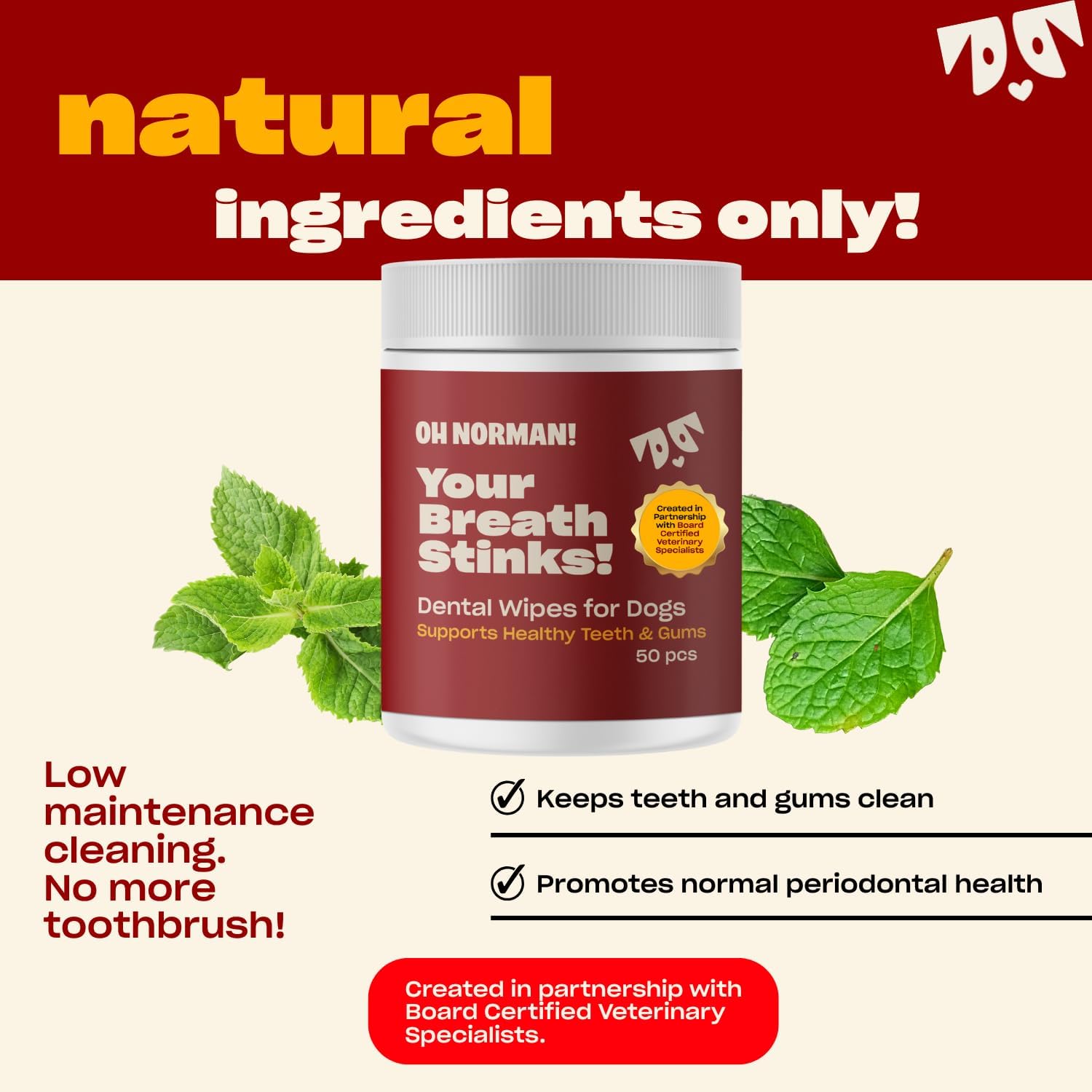 OH NORMAN! Dog Dental Wipes - Vet-Approved Pet Dental Finger Wipes for Oral Hygiene & Fresh Breath - Alternative to Finger Toothbrush for Dogs - No Fuss Dog Cleaning Supplies for Daily Use - 50 pcs