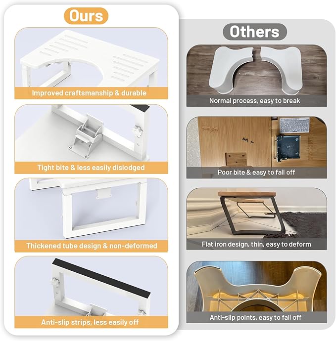 - Non-slip Upgrade: Poop stool adult legs with rectangular design to increase the contact surface, then non-slip strips cover whole surface, overlap the non-slip effect. An extra pair of non-slip pads for emergency use is also provided.