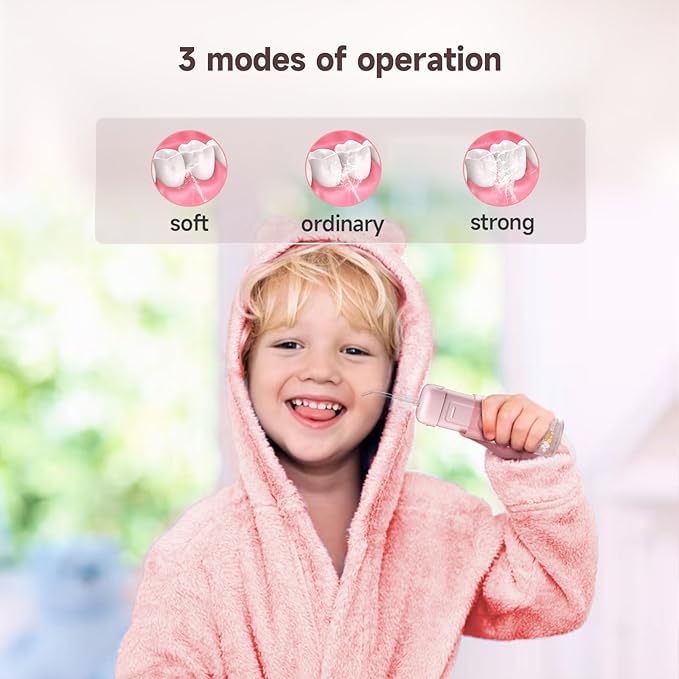 - [3 Pressure Modes for Deep Cleaning] - Research shows that traditional brushing and flossing cannot solve all of children’s oral problems. This water flosser has 3 pressure modes to meet various oral needs. With its 360° rotatable nozzle, it effectively helps kids clean hard-to-reach areas and removes up to 99.99% of food particles and plaque.