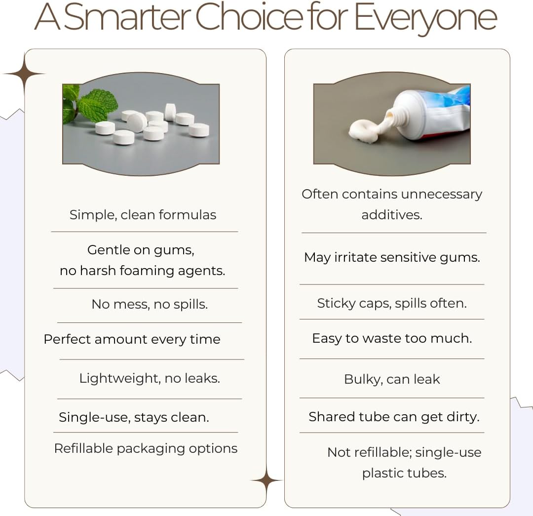 - GENTLE, VEGAN FORMULA: Free from SLS, dyes, triclosan, parabens, and artificial sweeteners, these toothpaste tablets provide a gentle yet effective clean, suitable for everyday use.