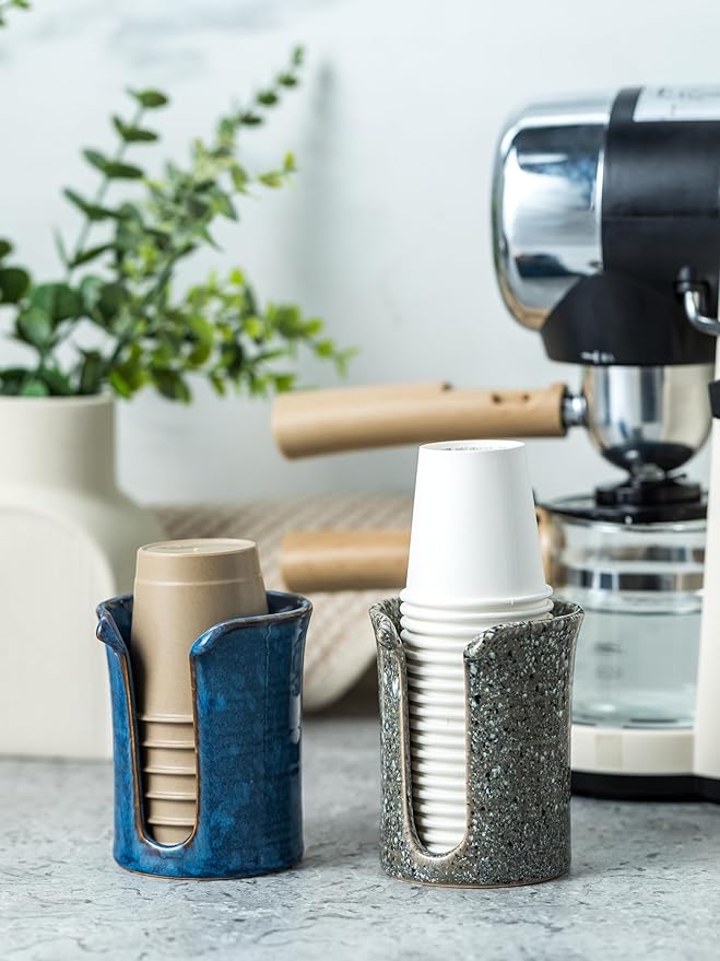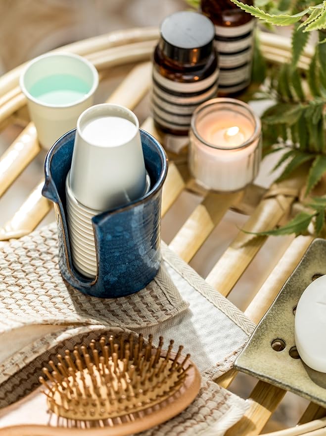 Bathroom Cup Holder, Ceramic Bathroom Cup Dispenser 3 Oz, Small Mouthwash Cup Dispenser Disposable Paper Cup Holder for Bathroom, Coffee Bar, Stoneware Design Modern Decor, Blue