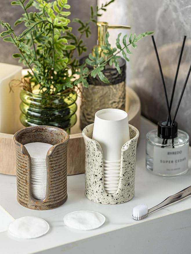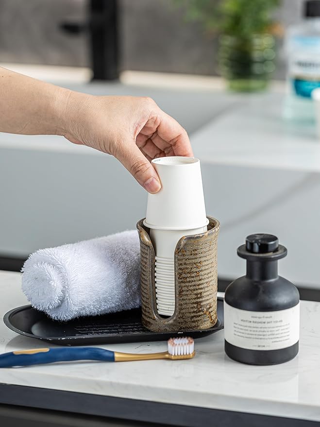 - Handmade Ceramic with Marble Look – This 3 oz bathroom cup dispenser combines a luxurious marble-inspired glaze with the warmth and charm of handcrafted ceramic. Each mouthwash cup holder is uniquely finished, bringing a touch of artisanal style to your countertop