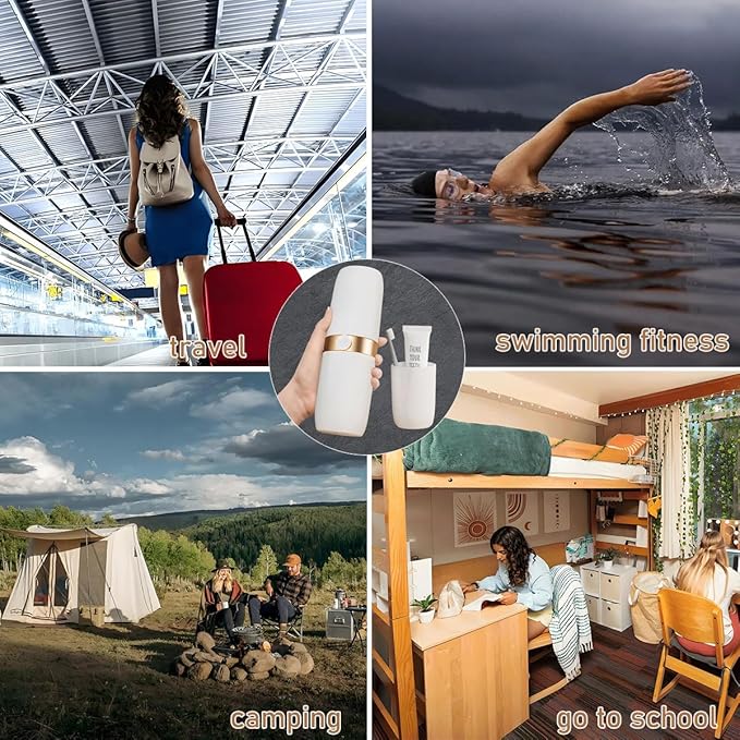 - 【CRAFTSMANSHIP AND DESIGN】 this travel toothbrush case,Matte surface, comfortable and non-slip feel.Smooth and delicate craftsmanship, The contrasting color connection in the middle is simple with a touch of luxury.with large cup mouth , two-section design,keep your toothbrushes clean; round corner design,not scratch skin or any items in your bag.It is connected by an attachment ring and can be separated as two cups.