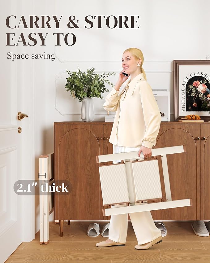 - Folds Up Neatly & Easy to Store: Open:18.1" W*20.6" L*24" H, Folded:18.1" L*2.1 "W*25.9" H, Net Weight: 6.06 Lbs. Top rung height is 17.5in. Folds thin only 2.1in. Our foldable step ladder fits well behind a door, under a bed or hang up
