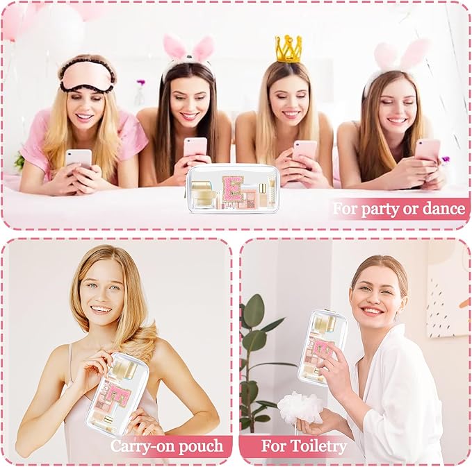 - 【Personalized Letter Design】The Clear makeup Pouch is designed with stitched glitter Chenille letters, you don't have to worry about it falling off. The unique Chenille 26 letter design, sparkling gold borders, and cute monogram patches have a strong personalized style, making your makeup bag the focus of attention
