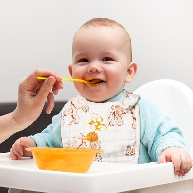 - Material: This feeding bib is made of cotton muslin, which is lightweight, breathable and not easy to fade. This soft material will make your baby feel comfortable and healthy, taking care of your baby's sensitive skin.