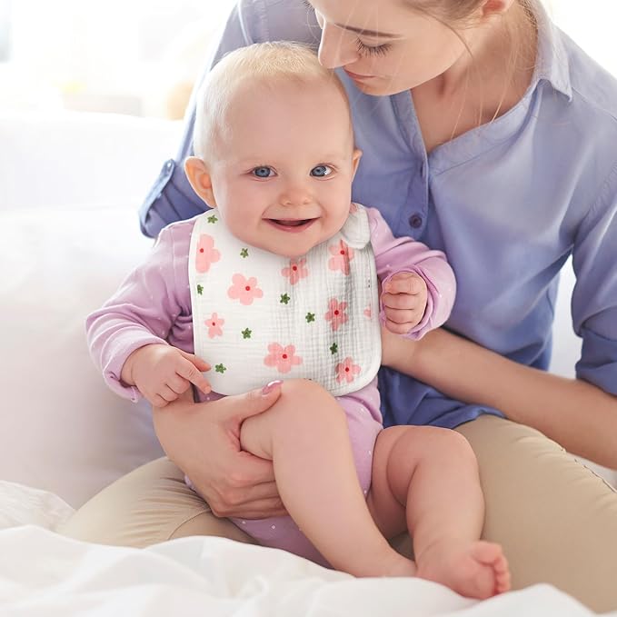 - Soft Material: Our baby bibs are made of cotton muslin, lightweight and breathable. This soft material will make your baby feel comfortable and baby’s sensitive skin will be well cared for.
