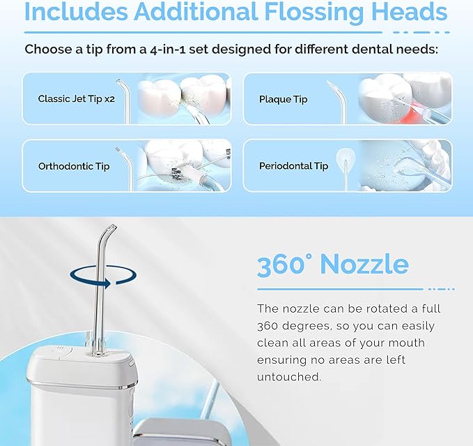 - ๐๐๐ยฐ ๐๐จ๐ญ๐๐ญ๐ข๐ง๐ ๐๐จ๐ณ๐ณ๐ฅ๐: The Ortho Water Cordless Water Flosser features a 360ยฐ rotating nozzle that effortlessly reaches all areas of your mouth, ensuring no spot is left uncleaned. This flexibility makes it easier to maintain a complete oral hygiene routine, particularly for those with orthodontic appliances or tight spaces between teeth.