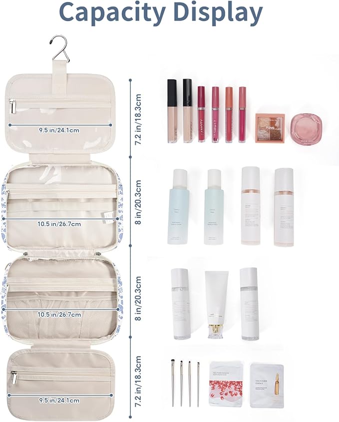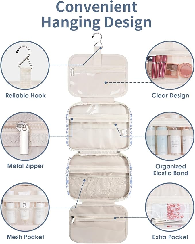 Narwey Hanging Floral Toiletry Bag for Women Travel Makeup Bag Organizer Toiletries Bag for Travel Size Essentials Accessories Cosmetics (Little Blue Flower (Medium))