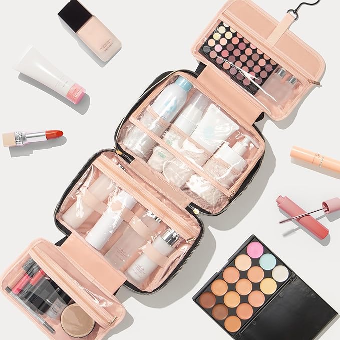 - STURDY HOOK & CONVENIENT DESIGNED: Equipped with 360 degree hanging hook, this travel toiletries bag for women can hanging anywhere such as towel rack, door knob and keeping stuff organized & dry and wet separation. Special 4-layer unfold design, It can fold and open quickly can find what you need, or you can fold it save space. Come with Lightweight handle, the travel makeup bag is easy to grab, and the back webbing secures effortlessly to suitcase rods, free your hands and easily travel