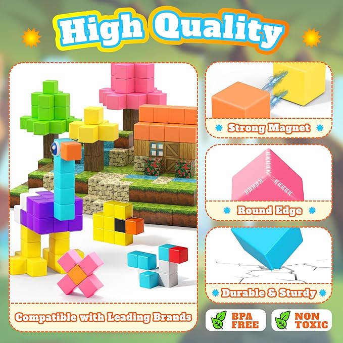 - Strong Magnetic & Cross-Brand Compatibility: Equipped with powerful embedded magnets, our blocks connect instantly and firmly for stable structures, supporting everything from suspension designs to creative models. They are fully compatible with other major magnetic tile brands, expanding creative possibilities and ensuring endless fun and learning as engaging magnet toys