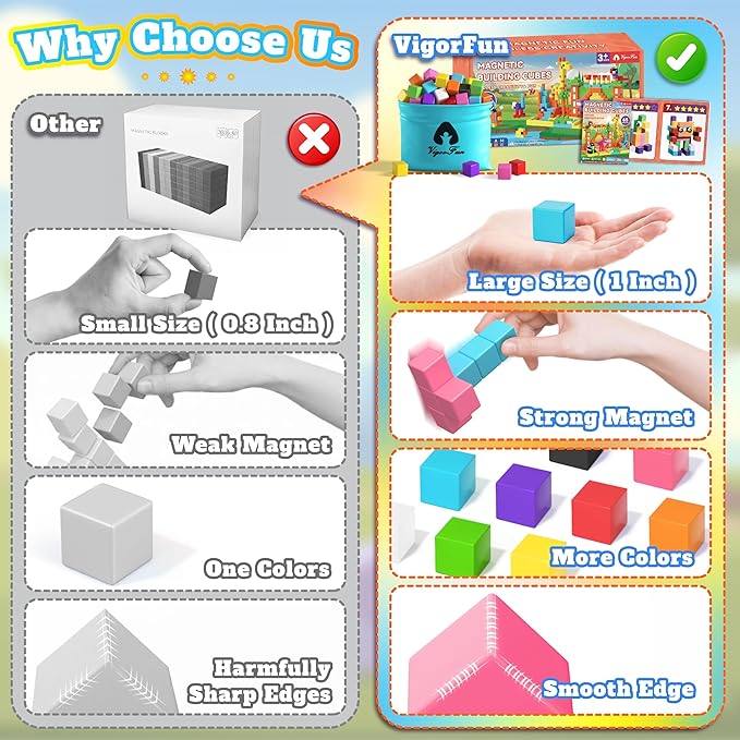 - Ultra-Safe & Durable ABS Material: Discover our safe and reliable magnetic blocks crafted from non-toxic, high-quality ABS material. They feature seamlessly smooth surfaces and rounded edges for safe handling by young builders. Built to withstand drops and bites, these durable blocks ensure worry-free, sensory-stimulating play